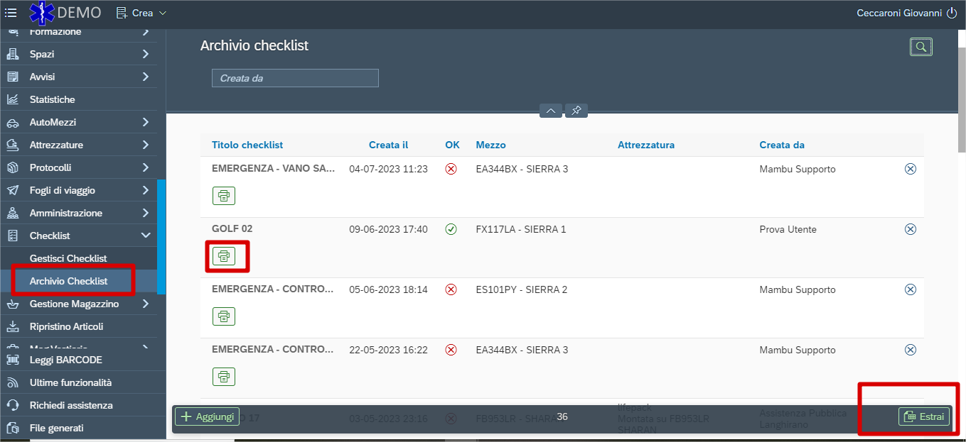 In “archivio checklist” troviamo tutte le checklist che sono state create in passato, è possibile stamparle o estrarle in un foglio excel.