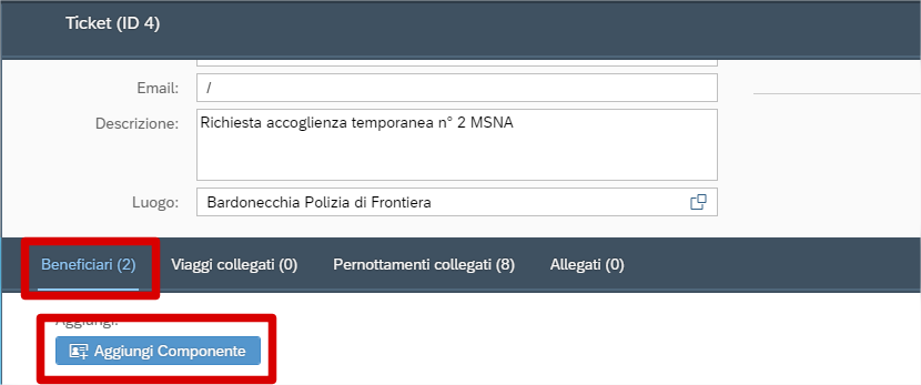 Vai alla tab Beneficiari all’interno di un ticket e seleziona il pulsante Aggiungi Componente
