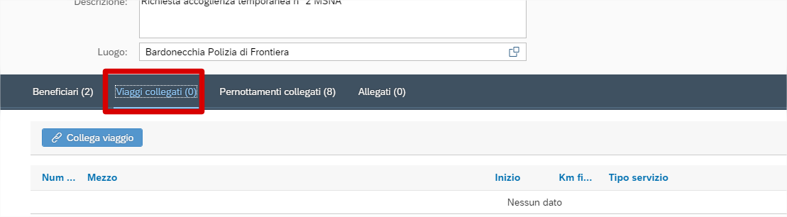 Vai alla tab Viaggi collegati del ticket e clicca sul pulsante Collega viaggio