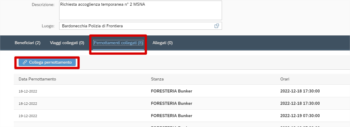 Vai alla tab Pernottamenti collegati del ticket e clicca sul pulsante Collega pernottamento