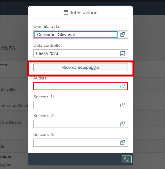 Col comando “Ricerca equipaggio” possiamo far compilare autonomamente la scheda, perché se il mezzo è in turno, grazie al collegamento con il tabelloni turni Mambu riesce a risalire all’equipaggio.