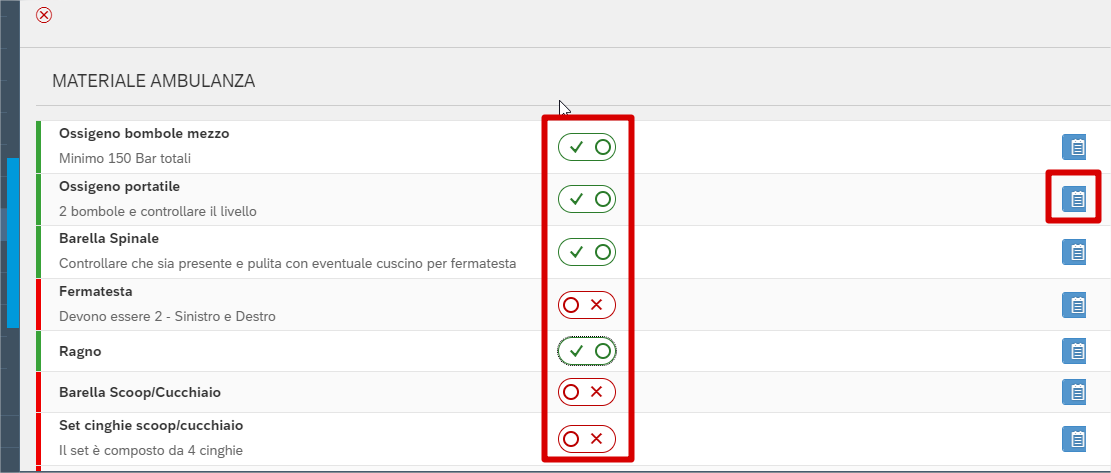 Dopo aver inserito l’equipaggio procediamo con il compilare la checklist spuntando gli oggetti che sono presenti sul mezzo. Tramite il bottone a destra di ogni riga è possibile aggiungere delle note.