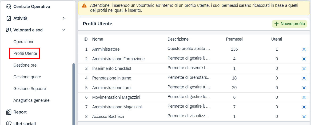 Un esempio potrebbe essere il profilo Volontario Base che comprende i seguenti permessi: