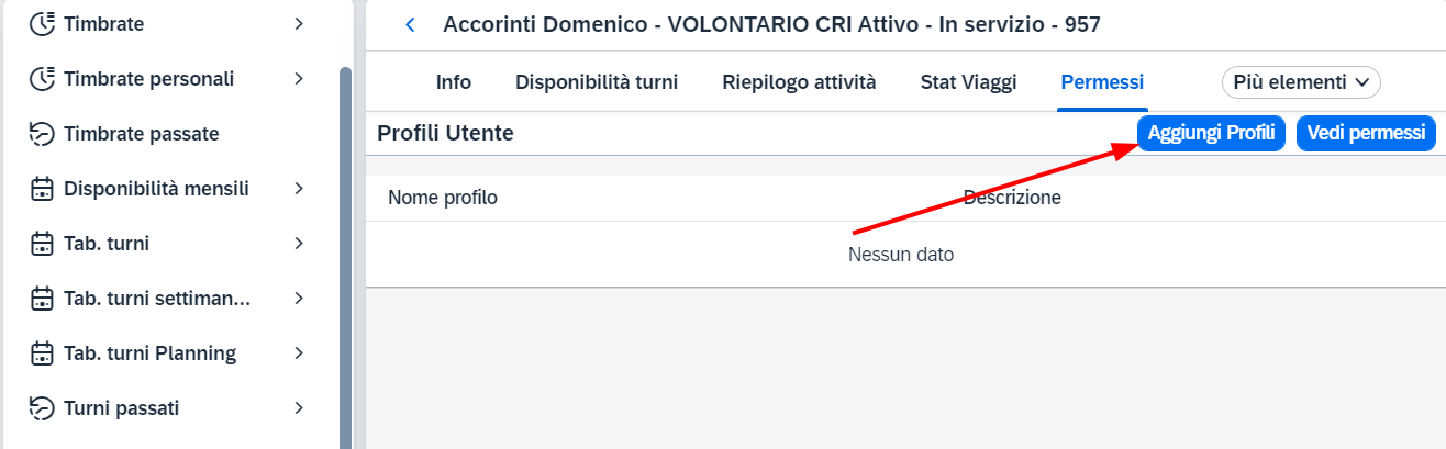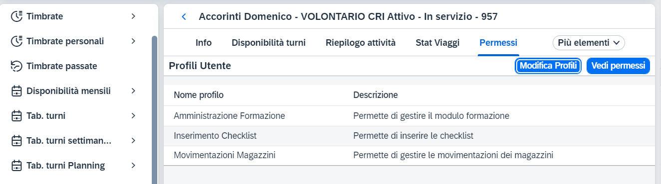 Per verificare i Profili Utente e di conseguenza i Permessi di un singolo utente bisogna andare nella sua anagrafica dalla lista presente in Volontari e soci ed aprire la tab Permessi.