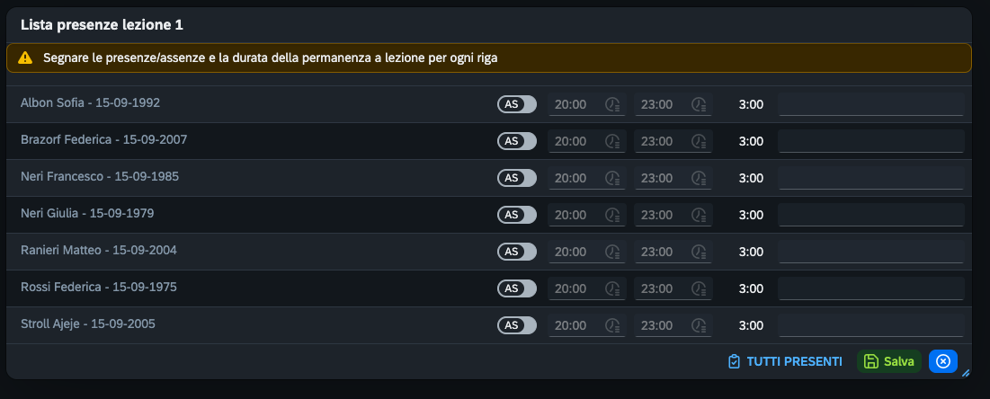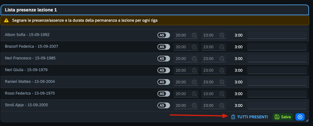 Esiste anche un bottone che permette di impostare massivamente le persone PRESENTI.