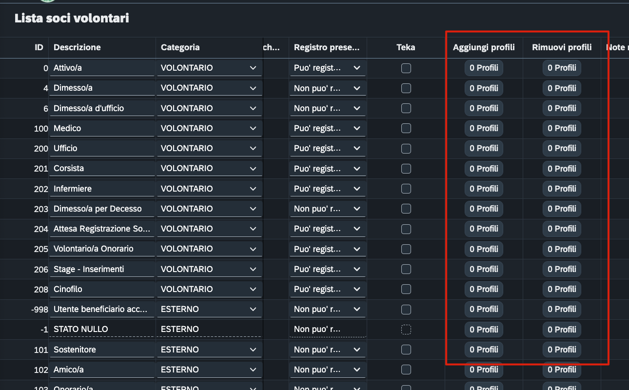 Le colonne sono due in quanto vogliamo dare la possiblità di aggiungere dei profili ma anche di rimuoverne altri nel caso in cui la persona ne avesse già alcuni in suo possesso