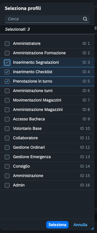 Cliccando su “Aggiungi profili” comparirà una lista in cui potrete selezionare tutti i profili che desiderate: