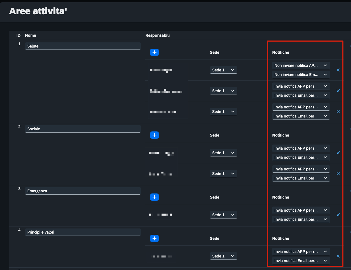 Per ogni area quindi e' importate segnare un responsabile e per ognuno di essi sara' possibile specificare se, in caso di inserimento “richiesta ore”, si intende inviare una notifica via app o via email.