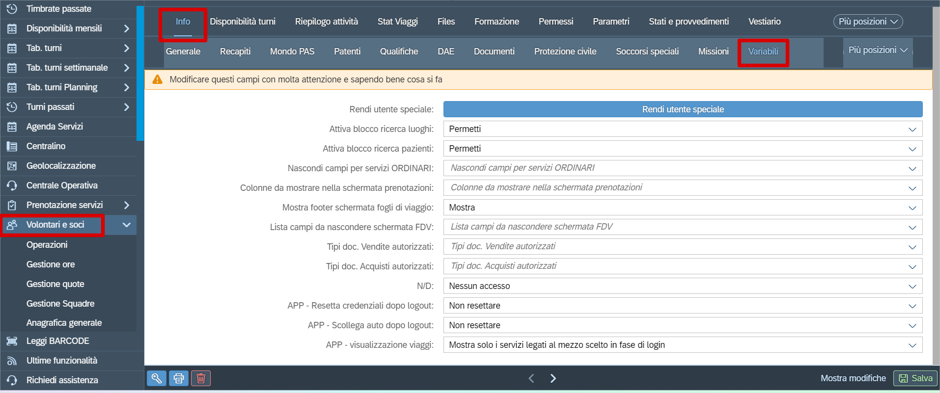 Per gestire alcune personalizzazioni richieste da varie associazioni, è stata creata una sezione all’interno dell’anagrafica volontari, per gestire alcuni settaggi per ogni volontario.