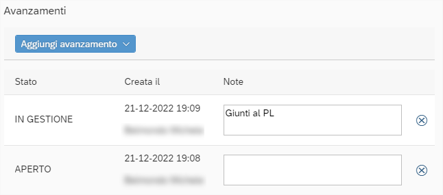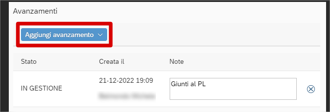 Seleziona lo stato dell’avanzamento dal menù a tendina ed inseririsci eventuali note legate all’avanzamento.