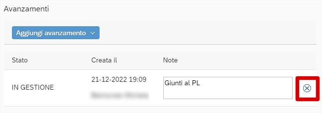 Dalla seleziona la x nella riga corrispondente all’avanzamento che si vuole cancellare e dare conferma