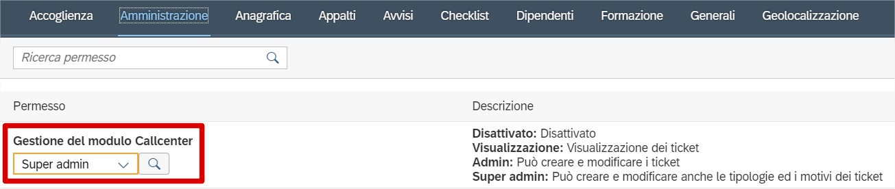 Assicurati di avere il permesso Gestione del modulo Callcenter a livello Super admin.