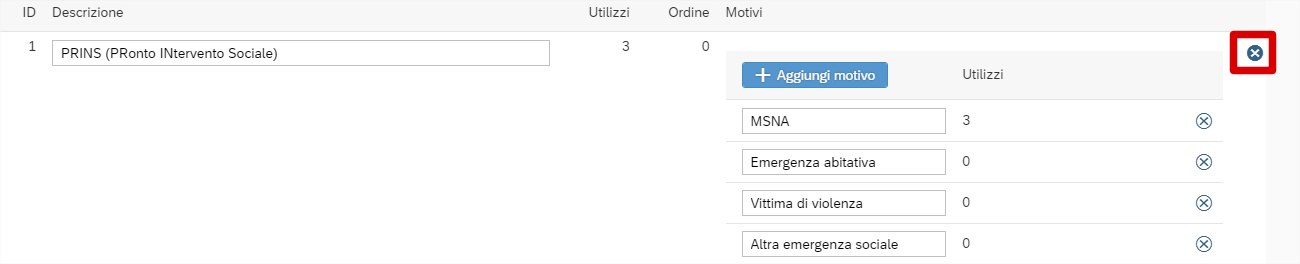 Clicca sulla x sulla destra della riga corrispondente alla tipologia che si desidera eliminare