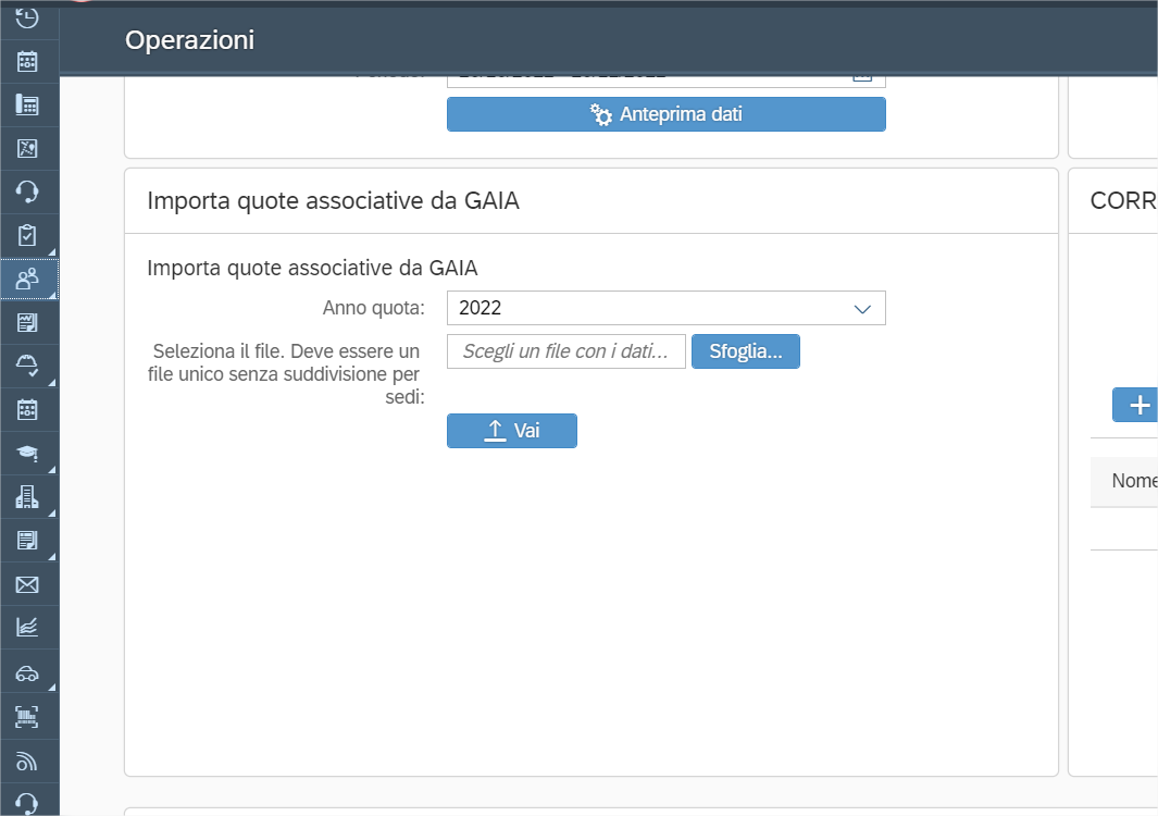 Scorrere la pagina fino a trovare la sezione “Importa quote associative da GAIA”;