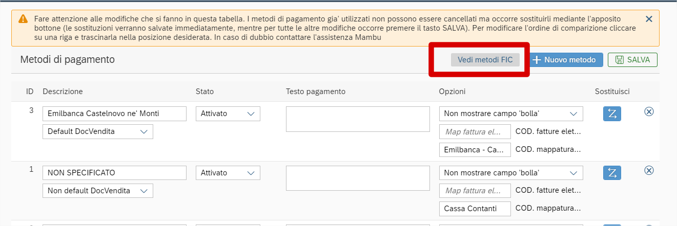 Accedere alla sezione metodi di pagamento e cliccare sul tasto “Vedi metodi FIC”: