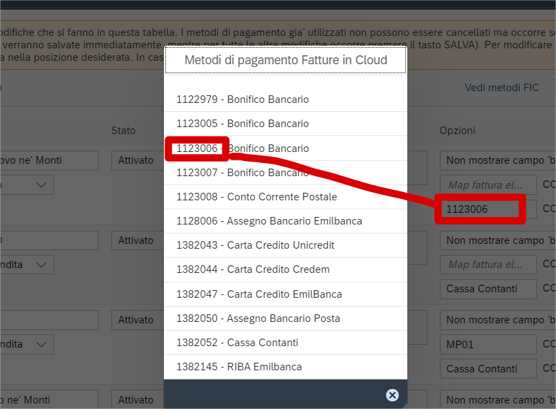 Se un metodo di mambu deve essere collegato ad un metodo di Fatture in cloud allora occorre riempire il campo “COD: mappatura esterna” del metodo di pagamento di MAMBU con il codice numerico del metodo di fatture in cloud.
