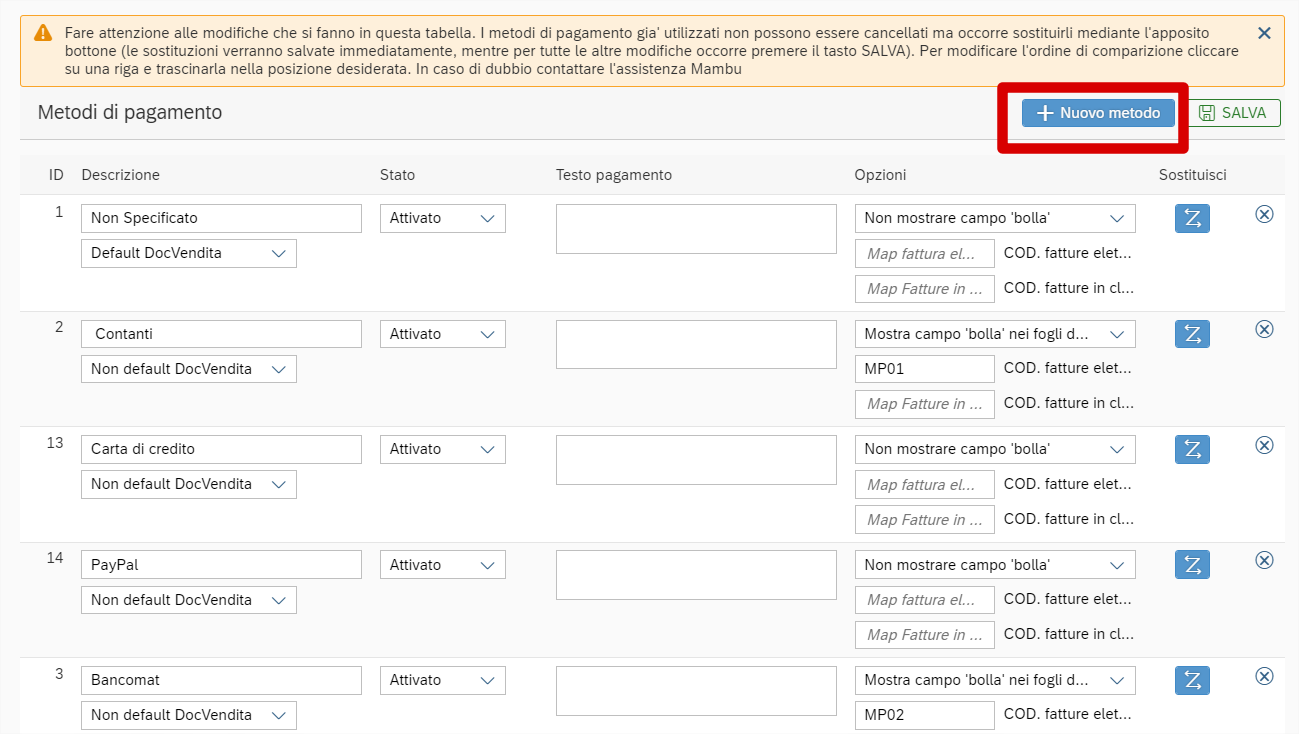 Campo “COD. fatture elettroniche”: la fatturazione elettronica ha dei valori predefiniti per indicare il metodo di pagamento utilizzato. In fase di esportazione di una fattura di vendita o importazione di una fattura di acquisto, Mambu deve conoscere a quale codice corrisponde il metodo di pagamento.