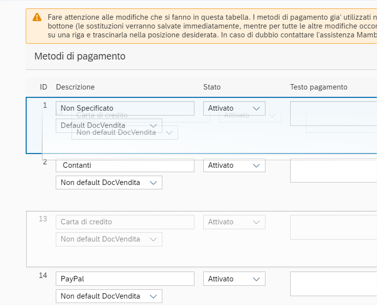 Il campo stato permette di attivare il metodo di pagamento. Se si desidera disattivare il metodo di pagamento ma non si vuole perdere lo storico di tutte le volte che è stato utilizzato allora non bisogna eliminarlo dalla tabella, ma occorre impostare il flag a disattivato.