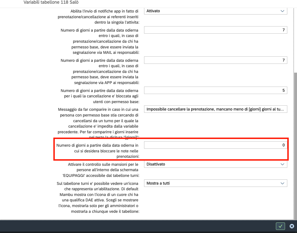 Si possono limitare ad una specifica finestra temporale queste notifiche, in quanto alcuni responsabili potrebbero non voler essere avvisati di volontari che si segnano in un turno tra un mese, ad esempio. Per impostare queste finestre, ci sono due variabili (per notifiche Email e per notifiche App) che servono per specificare l’intervallo di giorni, a partire dalla data odierna, nei quali i responsabili devono essere avvisati: