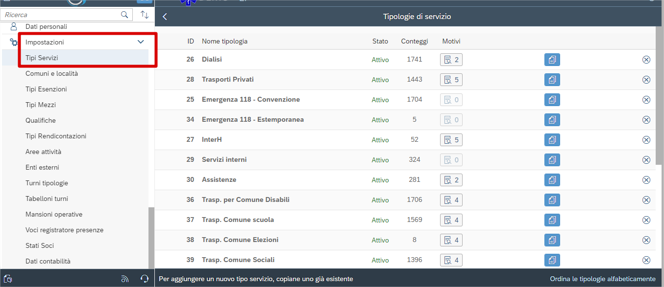 I tipi di servizi gli troviamo in “impostazioni” → “tipi servizi”. Ogni associazione può creare i propri.