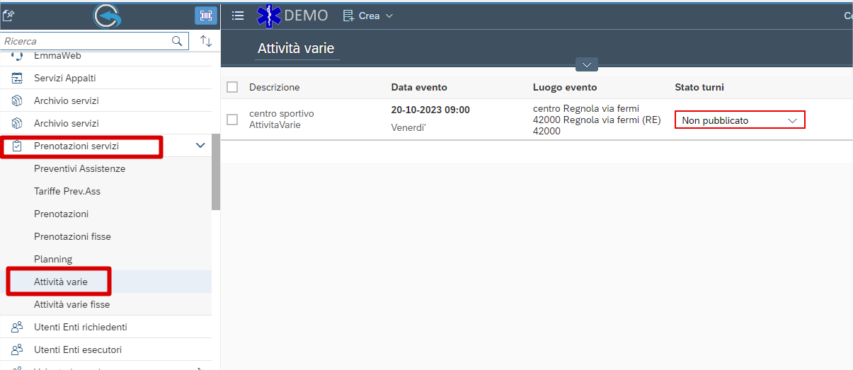 La prenotazione (inteso come evento come ad esempio un trasporto sanitario, una assistenza ad una manifestazione, un turno di emergenza, ecc…) è un oggetto al quale un utente può segnarsi in un turno e contiene tante opzioni tra cui voci: