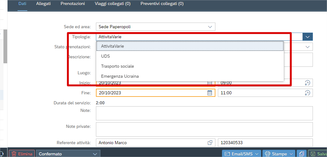 Abbiamo quindi un tipo di prenotazioni che si possono fare, cioè le “attività varie”.