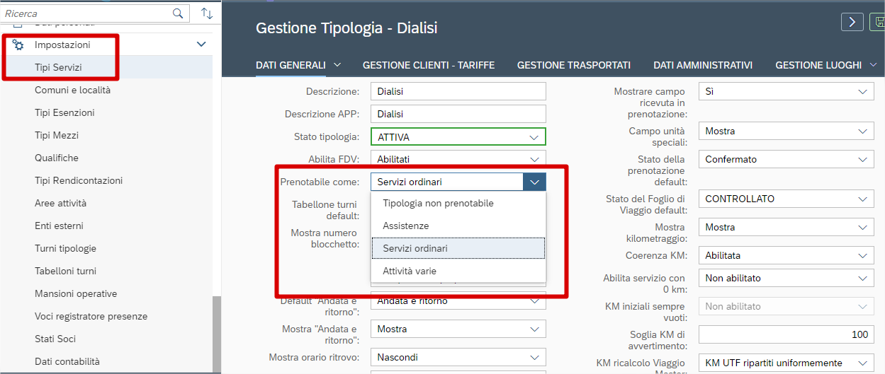 Tra le opzioni abbiamo anche “tipologia non prenotabile”, esempio un viaggio di emergenza. Mentre se l’associazione vuole gestire il viaggio dall’applicazione la prenotazione deve essere prenotabile, quindi esempio l’emergenza la salverà come “servizio ordinario”.